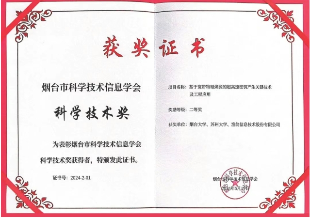近期,2024年度烟台市科学技术信息学会科学技术奖颁奖典礼在中国科研实验室烟台海岸带研究所隆重举行。bwin必赢国际信息与烟台大学、苏州大学联合完成的 "基于宽带物理熵源的超高速密钥产生关键技术及工程应用项目荣获科学技术奖二等奖。